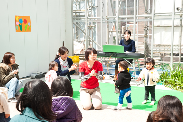 先週の開催された紙芝居のほかに育良クリニック主催の「親子でリトミック」も開催されました。一番上の写真が開催の模様。